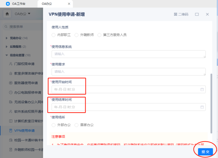 这里特别要注意,如上图所示:申请表单中的“使用开始时间”和“使用结束时间”一定要写准确,以免影响使用。