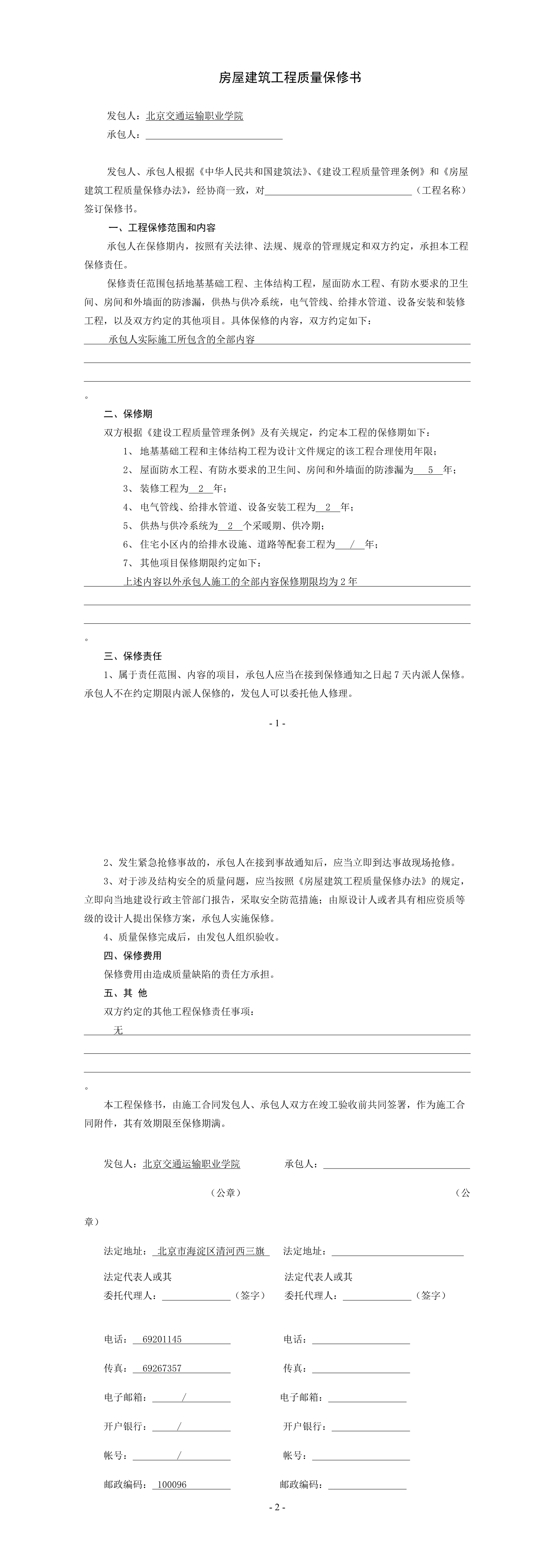 房屋建筑工程质量保修书