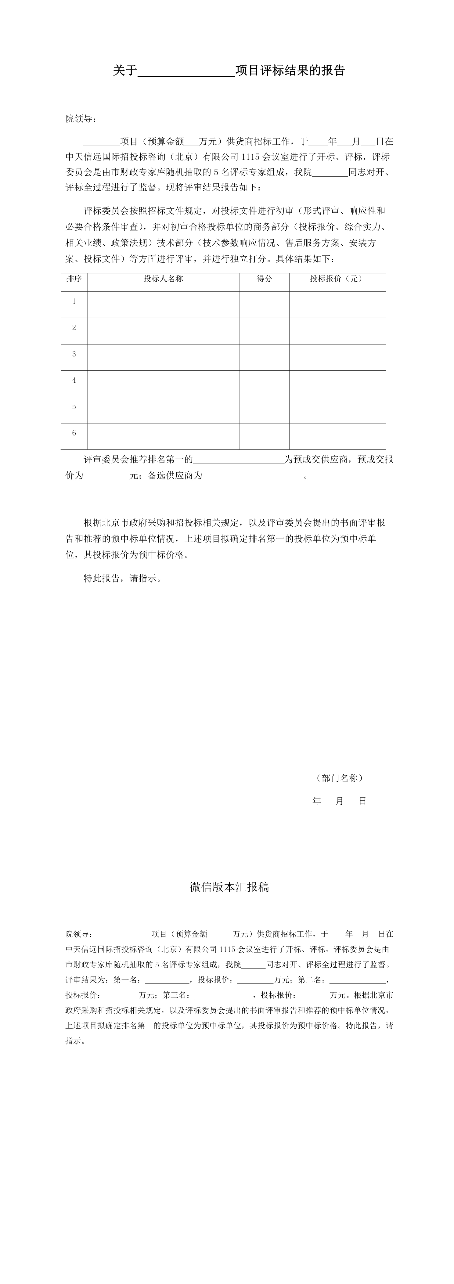 项目评标结果报告(样本)