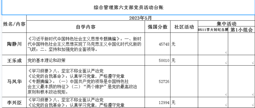 综合管理第六党支部积极设立电子台账推动学习型支部建设。为推动落实习近平新时代中国特色社会主义思想主题教育取得实效,加强“学习型”支部建设,综合管理第六党支部将支部全体党员学习情况融入一册“电子台账”。内容包括党员自主学习内容情况、支部党员集中学习内容情况、“学习强国”分数累计、参与社区活动次数等,按月进行汇总整理,累计形成年度台账。电子台账的设立,推动支部建设更扎实、规范,营造了“赶、学、比、超”的学习氛围。下一步,综合管理第六支部将继续创新学习模式和方法,结合支部品牌建设,不断加强支部自身建设,提升党员群众理论知识水平,努力打造具有示范效应的“学习型”党支部。
